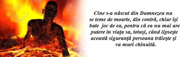 Cine s-a născut din Dumnezeu nu se teme de moarte, din contră, chiar îşi bate joc de ea, pentru că ea nu mai are putere în viaţa ei, totuşi, când lipseşte această siguranţă, persoana trăieşte şi va muri chinuită. Cu cât trece mai mult timpul, persona va avea mai multă teamă de moarte.